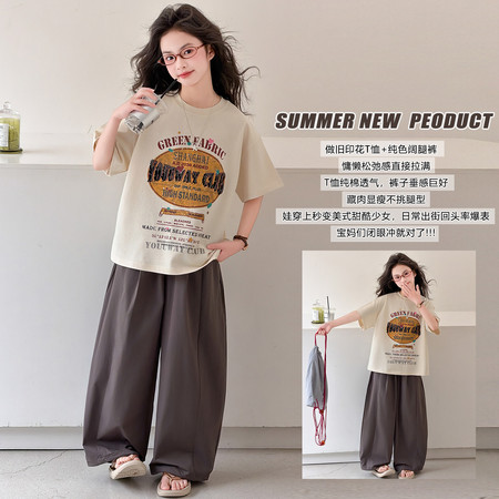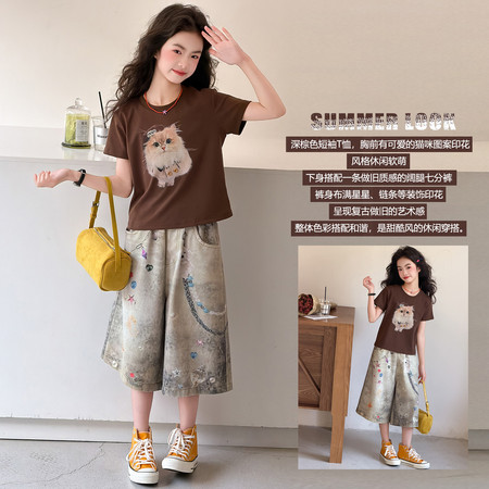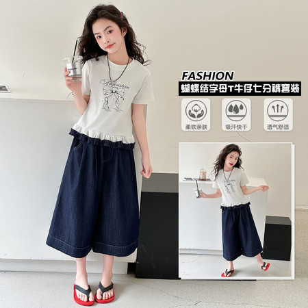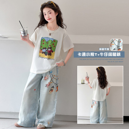 1*1收藏“撞色涂鸦t恤牛仔中裤套装”